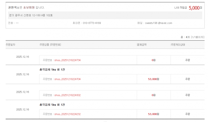 주문 중복으로 주문번호 :shop_20251216224704, 2.251216224734 취소입니다.